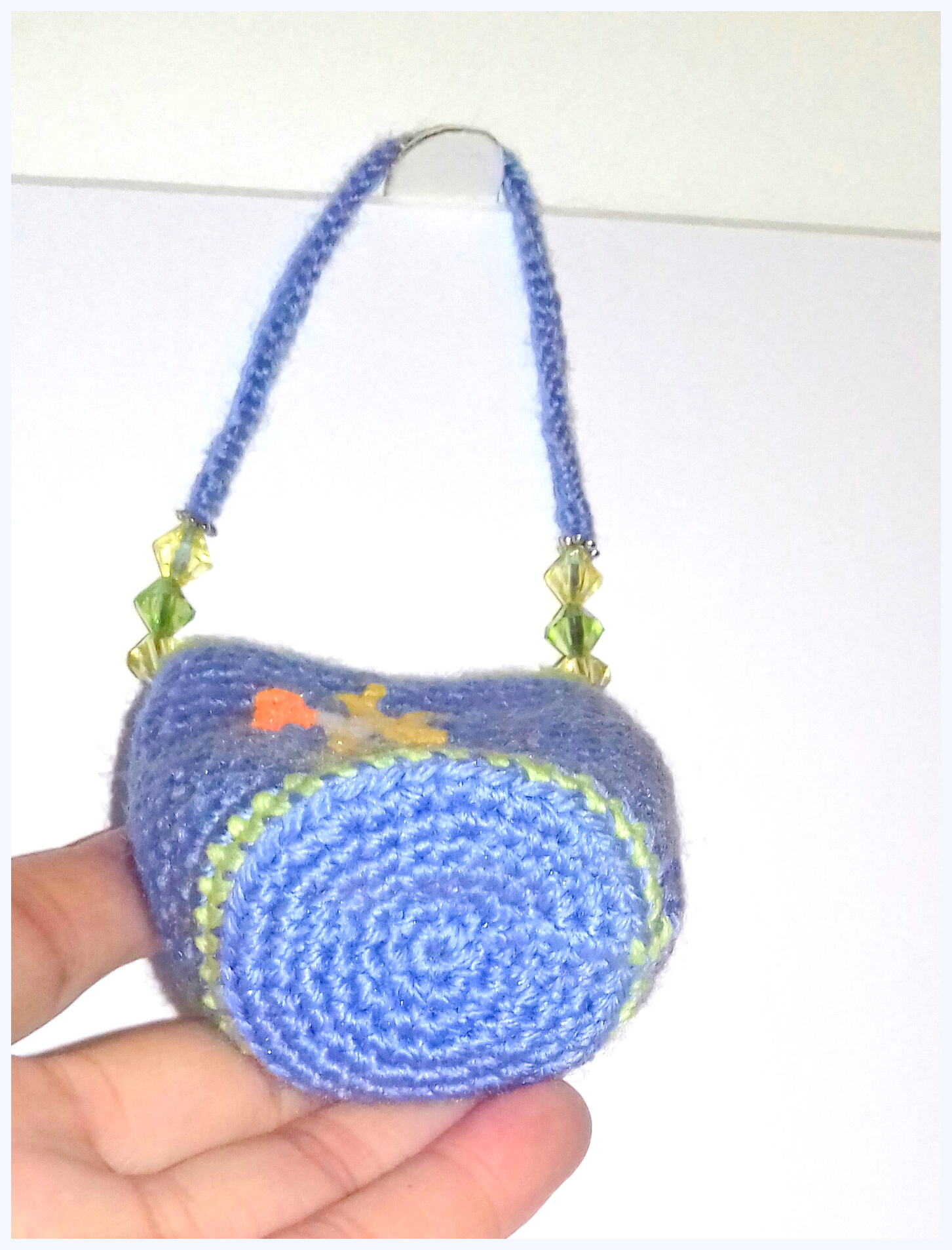 All my bags are made with dk yarn, but the contrast lining is in a fine 4 ply yarn. Dimensions: approx 3″x3″ excl. the handle. I achieve a tight fabric effect, which holds it’s form. Customers have used my Tiny Bags to put jewellery, earphones, lip seals, keys, coins or tokens in. They are also perfect to hang on the Christmas tree.
