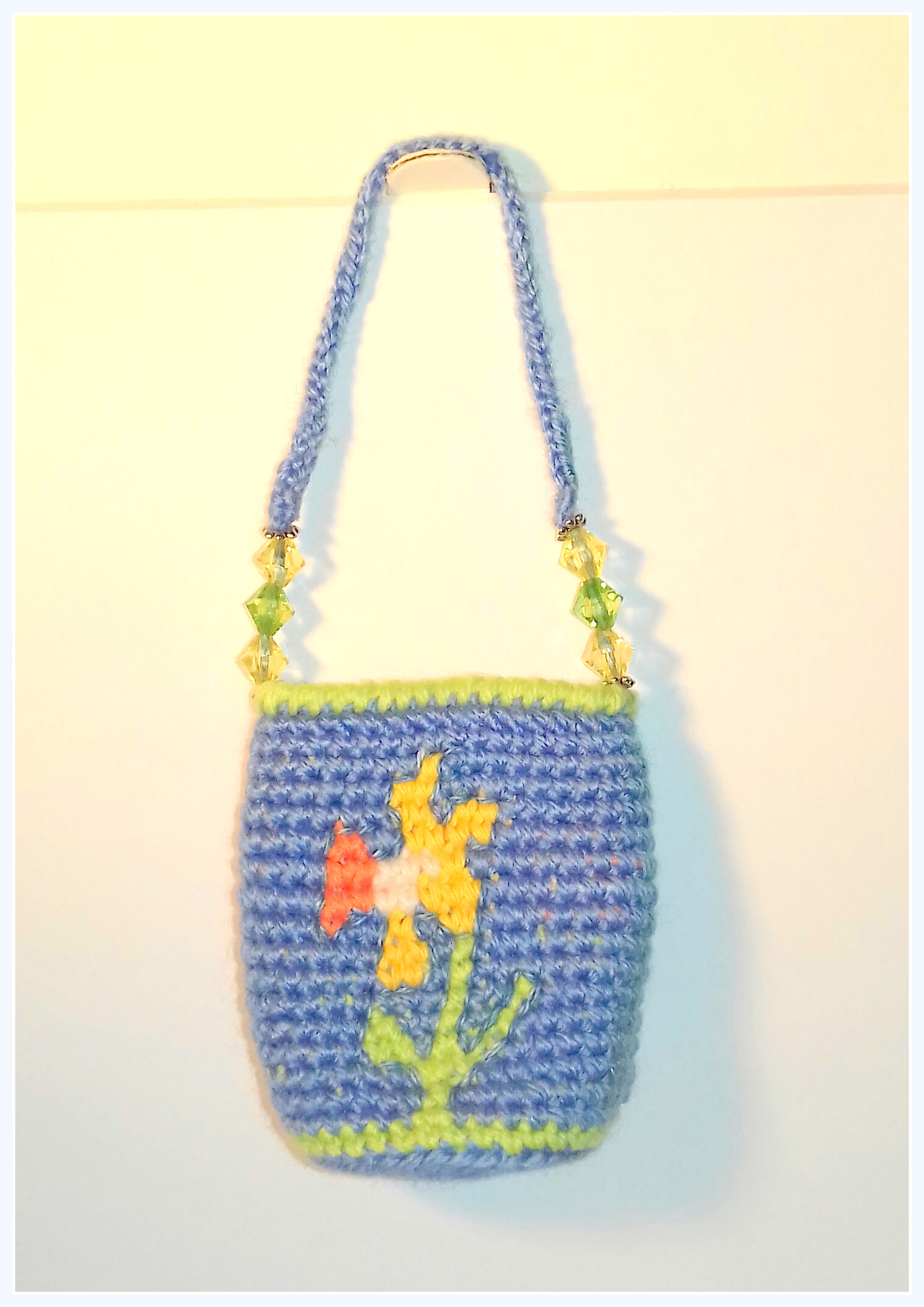 Yellow and green coloured beads on the handle, bring out the colours in the daffodil and the blue bag brings a touch of a sunny spring day to the piece.