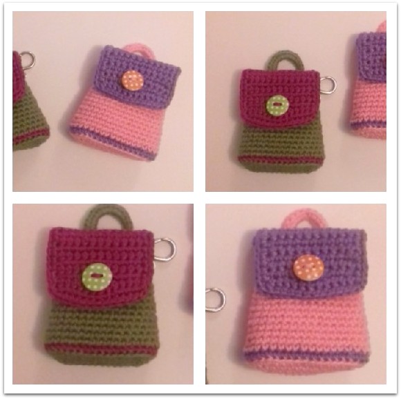All my bags are made with dk yarn. Dimensions: approx 3″x 3″ excl. the handle. I achieve a tight fabric effect, which holds it’s form. Customers have used my Tiny Bags to put jewellery, earphones, lip seals, keys, coins or tokens in. They are also perfect to hang on the Christmas tree. The lobster claw clip will attach the tiny satchel to a bag or rucksack.