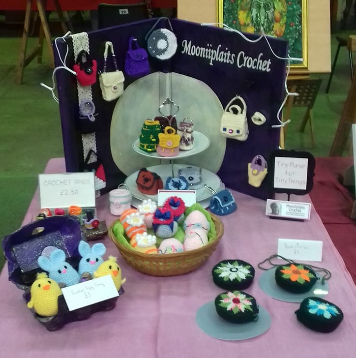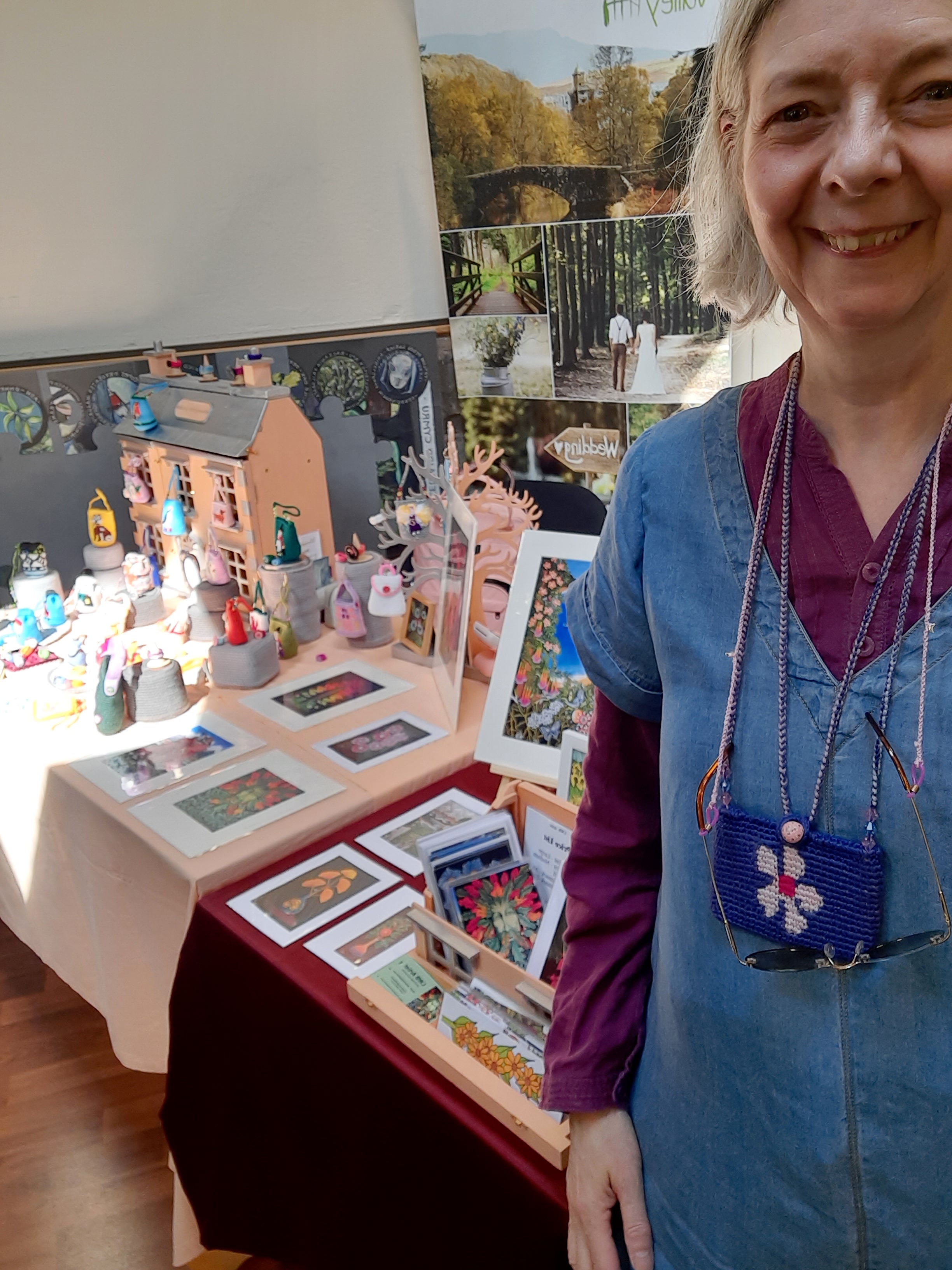 A woman sitting opposite me admired it and asked me if I sold them. I was already helping dad sell his artwork, at craft fairs, so I decided to make up a few of my coin bag designs to sell. To begin with I only had enough stock to sit on tea plates – seems like so long ago now. From there they have evolved into the many designs you can find here and customers have found different uses for them.